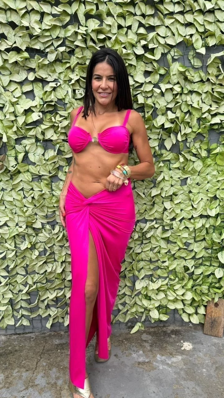 Rosa Pink Concha Calcinha Fininha Fio Duplo + Top Meia Taça + Saia